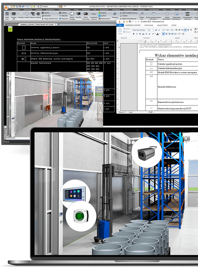 - Tworzenie rysunków instalacji niskoprądowej: od szaf rozdzielczych, kabli i skrętek, po urządzenia takie jak kamery, monitory, czujniki, przyciski, telefony i inne.